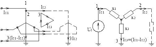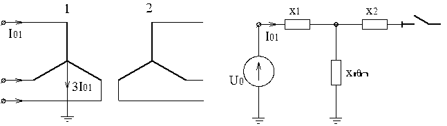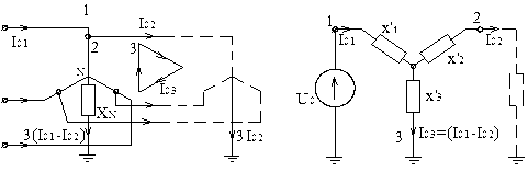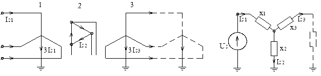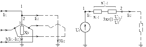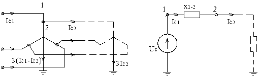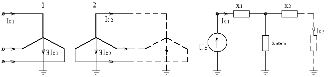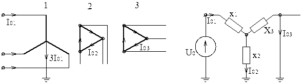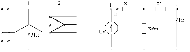На рисунке 9.6 а, б, в приведены основные варианты соединения обмоток двухобмоточного трансформатора, при которых приложенное к обмотке 1 напряжение нулевой последовательности вызывает в одной или в обеих обмотках ток той же последовательности. Справа показаны схемы замещения трансформатора (без учета активных сопротивлений) для токов нулевой последовательности.