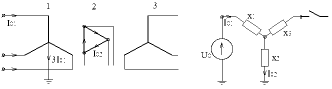 На рисунке 9.6д предполагается, что путь для тока нулевой последовательности на стороне обмотки 3 обеспечен. В этом случае в схему нулевой последовательности трансформатор должен быть введен своей схемой замещения.
