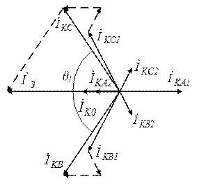 Векторные диаграммы напряжений и токов в месте двухфазного короткого замыкания на землю приведены на рисунке 10.7. Угол θI между токами поврежденных фаз может изменяться в пределах 600 < θI ≤ 1800, стремясь к нижнему пределу при