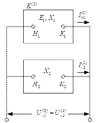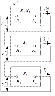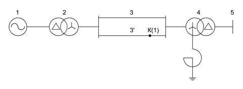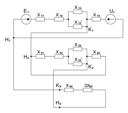 Пример составления комплексной схемы замещения при однофазном КЗ для схемы рисунка 10.10 приведен на рисунке 10.11.