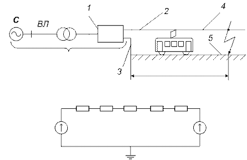 1 – преобразовательная подстанция; 2 – питающий провод; 3 – отсасывающий провод;