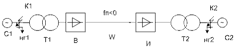 Вставка постоянного тока содержит выпрямитель В, инвертор И, линию постоянного тока W, трансформаторы Т1 и Т2 соответственно выпрямителя и инвертора (рис. 12.3). Эти вставки выполняют функцию транспортных линий электрической передачи, развязывая в то же время объединенные подсистемы при возникновении в них переходных процессов. Ток КЗ в точке К1 определяется параметрами С1. Подпитка со стороны вставки отсутствует. При КЗ в точке К2 ток КЗ определяется параметрами С2. Подпитка со стороны вставки не превышает её нагрузочного тока.