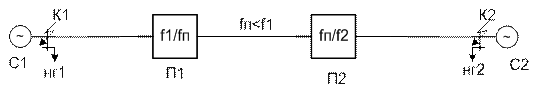 Вставки переменного тока непромышленной частоты предназначены для связи узлов сетей промышленной частоты (рис. 12.4). Эти вставки содержат ферромагнитный преобразователь (делитель) частоты П1, ЛЭП W, ферромагнитный преобразователь (умножитель) частоты П2. Частота передачи fn = 25 Гц.