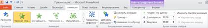 6) Вкладка "Анимация" (позволяет применить эффекты анимации к объектам слайда, изменить или удалить эти эффекты. В группе Время находятся области для настройки параметров Начало и Продолжительность).