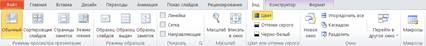 7) Вкладка "Показ слайдов" (с помощью этой вкладки можно запустить показ слайдов, настроить его параметры или скрыть отдельные слайды). 8) Вкладка "Просмотр" (позволяет проверить орфографию, изменить язык презентации или определить изменения в текущей презентации по сравнению с другой презентацией). 9) Вкладка "Вид" (позволяет показать образец слайда, образец заметок и сортировщик слайдов. Кроме того, здесь можно включить или выключить линейку, сетку и направляющие в документе.