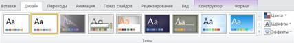 4) Вкладка "Дизайн" (с помощью этой вкладки можно настроить фон, выбрать стиль и цвета темы или задать параметры страницы для презентации).