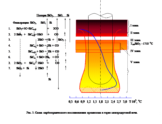 Зона 3. 1625-1850 оС. Низкотемпературное замедленное восстановление кремнезема по реакции (2), при зависании шихты с образованием SiO, часть которого может находиться в газообразном состоянии и выдуваться из слоя реакционными газами. Фильтрация и адсорбция газов и паров. Плавление и отекания вниз кварцита и смывание остатков С и SIC.