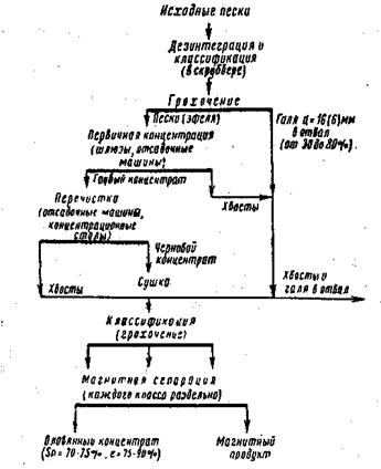 Типовая схема переработки оловосодержащих песков включает (рис. 40) дезинтеграцию и классификацию песков в скруббере с удалением в отвал гали; первичное обогащение песков на шлюзах, отсадочных машинах или винтовых сепараторах с получением грубых концентратов, содержащих в себе основную массу касситерита и других тяжелых минералов (магнетита, ильменита, граната); перечистку грубых концентратов на отсадочных машинах или концентрационных (сотрясательных) столах.