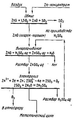 При гидрометаллургическом получении цинка (см. рис. 76) обжиг ведут с получением огарка-порошка при 900—1000°С. Высокая дисперсность огарка способствует быстрому и полному выщелачиванию его в растворе H2SO4. Раствор ZnS04• aq подвергают электролизу, при котором восстанавливается цинк и регенерируется кислота для повторного использования в качестве растворителя ZnO из огарка.