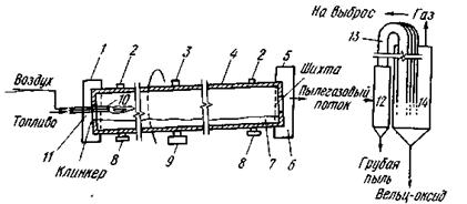 1 — нижняя головка печи; 2 - опорные бандажи; 3 — венечная шестерня на привод; 4 - корпус печи; 5 - верхняя головка печи; 6 — загрузочный торец печи; 7 — слой шихты; 8 - опорные ролики; 9 - привод; 10 - короткофакельная горелка (на мазуте или природном газе); 11 - выпускной торец печи; 12 - пылевая камера; 13 - кулера; 14 - рукавные фильтры