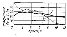 Рис. 18. Изменение содержания железа (1) и серы (2) в штейне по ходу конвертирования