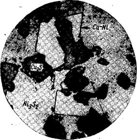 Режим охлаждения файнштейна. Медно-никелевый файнштейн имеет ясно выраженное кристаллическое строение и состоит из кристаллов двух видов: кристаллов сульфида никеля с небольшой примесью сульфида медики кристаллов сульфида меди с небольшой примесью сульфида никеля. В файнштейне с малым содержанием серы имеются кристаллы сплава меди с никелем. Структура медно-никелевого файнштейна показана на рис.78.