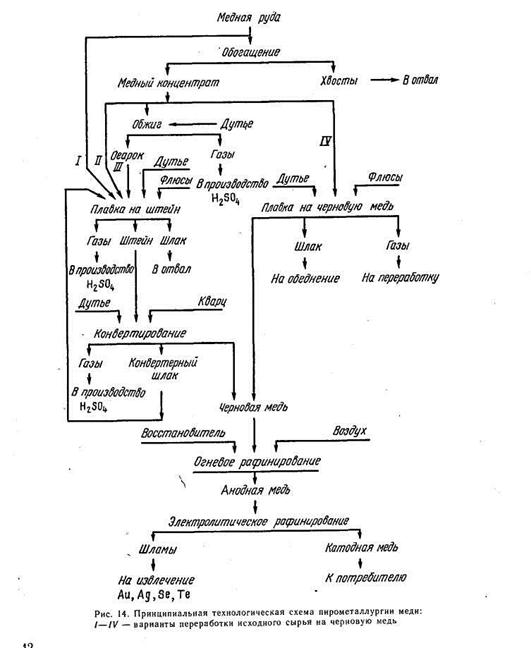 Современная пирометаллургия меди, несмотря на принципиальную общность используемых различными предприятиями технологических схем, предусматривает несколько вариантов (I — IV) ее практического осуществления (рис. 14).