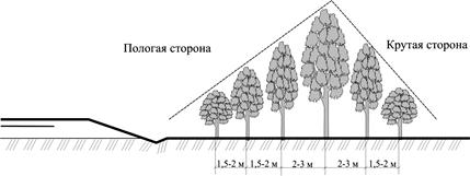 1-й ряд от дороги — низкий кустарник; 2-й ряд от дороги — высокий кустарник; 3-й ряд от дороги — сопутствующая древесная порода; 4-й ряд от дороги — главная древесная порода; 5-й ряд от дороги — сопутствующая древесная порода; 6-й ряд от дороги — высокий кустарник.