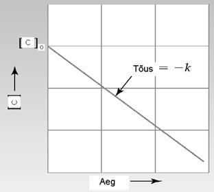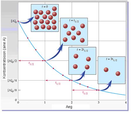 В случае реакции 1-го порядка концентрация исходного вещества спадает в 2 раза в течение определенного интервала времени – этот интервал называется периодом полупревращения (poolestusajaks) t.