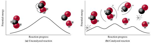 Механизм действия катализатора состоит в основном в преобразовании пути реакции во многоступенчатый процесс, причем энергия активации на каждом этапе ниже, чем энергия активации реакции без катализатора.