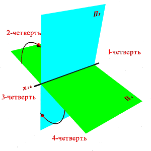 Плоскости проекций делят пространство на четыре двугранных угла – четверти. Рассматривая ортогональные проекции, предполагают, что наблюдатель находится в первой четверти на бесконечно большом расстоянии от плоскостей проекций.