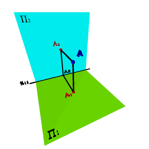 Справедливо и обратное, т. е. если на плоскостях проекций даны точки А 1 и А 2 расположенные на прямой, пересекающей ось x 21 в точке А x под прямым углом, то они являются проекцией некоторой точки А.