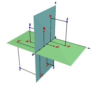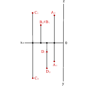 На рисунке 8 представлены точки A, B, C и D,расположенные в разных четвертях пространства и их эпюр (A - в первой, B - во второй, C - в третьей и D - в четвертой четвертях)