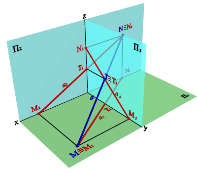 | 1. Для построения горизонтального следа М прямой необходимо продолжить ее фронтальную проекцию до пересечения с осью x и в этой точке восстановить перпендикуляр к оси до пересечения с горизонтальной проекцией прямой. 2. Для построения фронтального следа N прямой нужно из точки пересечения горизонтальной проекции её с осью 0x восстановить перпендикуляр до пересечения с фронтальной проекцией прямой. С помощью этих правил найдены на эпюре следы прямой а(рис.20). Следы прямой, являются точками, в которых прямая переходит из одного октанта в другой, позволяют отмечать её видимость. Видимой частью прямой будет та, которая расположена в пределах первого октанта. | |