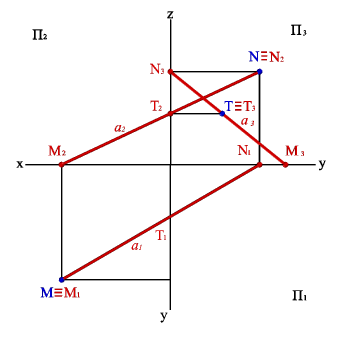 Следы прямой являются точками частного положения. Одноименные проекции следа прямой совпадают с самим следом, а другие проекции лежат на осях. Например, фронтальный след прямой N2ºN, а N1 лежит на оси x, N3 - на оси z. Отмеченные особенности в расположении следов проекций позволяет сформулировать следующие правила: