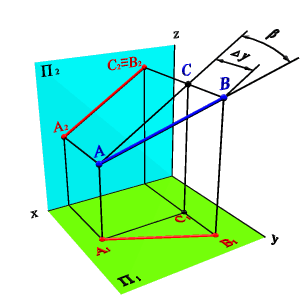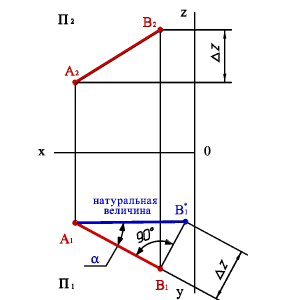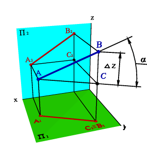 | Рисунок 21. Определение натуральной величины отрезка и угла его наклона к горизонтальной плоскости проекций |
