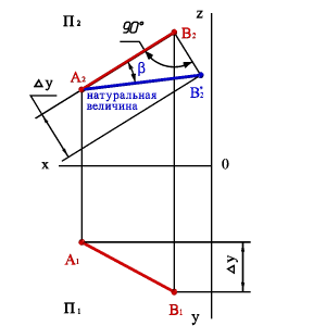 | Рисунок 22. Определение натуральной величины отрезка и угла его наклона к фронтальной плоскости проекций |