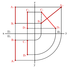 Особый случай представляют собой прямые, параллельные одной из плоскостей проекций. Например, фронтальные и горизонтальные проекции профильных прямых параллельны, но для оценки их взаимного положения необходимо сделать проекцию на профильную плоскость проекций (рис.24). В рассмотренном случае проекции отрезков на плоскость П3 пересекаются, следовательно, они не параллельны.