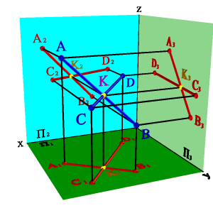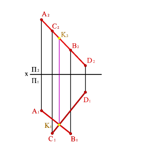 Пересекающимися называются две прямые лежащие в одной плоскости и имеющие одну общую точку. Если прямые пересекаются, то точки пересечения их одноименных проекций находится на одной линии связи (рис.25).