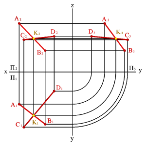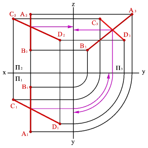 1. Если одна из прямых параллельна какой-либо из плоскостей проекций, например, профильной (рис.26), то по двум проекциям невозможно судить об их взаимном расположении. Так горизонтальная и фронтальная проекции отрезков АВ и СД пересекаются, причем точка пересечения проекций лежит на одной линии связи, однако сами отрезки не пересекаются, потому что точка пересечения профильных проекций этих отрезков не лежит на одной линии связи с точками пересечения их горизонтальной и фронтальной проекций.