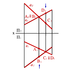 Точке пересечения фронтальных проекций прямых (рис.28) соответствуют две точки А и В, из которых одна принадлежит прямой а, другая в. Их фронтальные проекции совпадают лишь потому, что в пространстве обе точки А и В находятся на общем перпендикуляре к фронтальной плоскости проекций. Горизонтальная проекция этого перпендикуляра, обозначенная стрелкой, позволяет установить, какая из двух точек ближе к наблюдателю. На предложенном примере ближе точка В, лежащая на прямой в, следовательно, прямая в проходит в этом месте ближе прямой а и фронтальная проекция точки В закрывает проекцию точки А. (Для точек С и D решение аналогично).