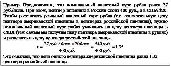 По отдельному товару реальный валютный курс показывает относительную цену единицы иностранного товара, выраженного в определенном количестве единиц товара, произведенного внутри данной страны.