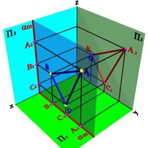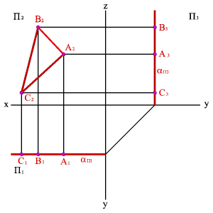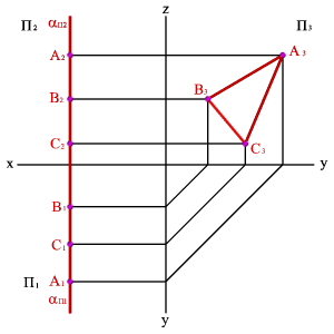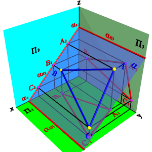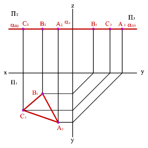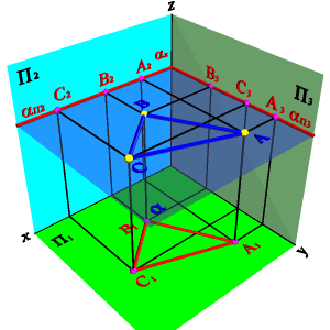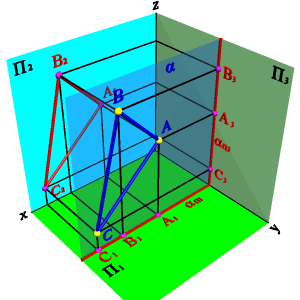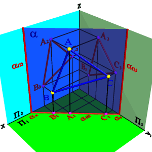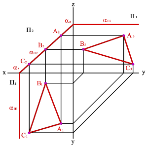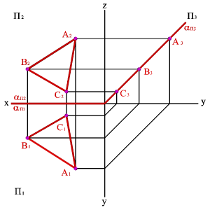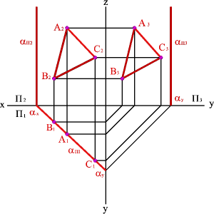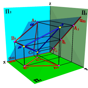 1. Плоскость не перпендикулярная ни одной плоскости проекций называется плоскостью общего положения. Такая плоскость пересекает все плоскости проекций (имеет три следа: - горизонтальныйaП1; - фронтальный aП2; - профильный aП3).