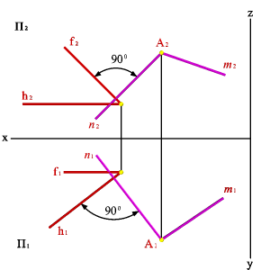 Верно и обратное: если проекции прямой перпендикулярны одноименным проекциям соответствующих главных линий плоскости (горизонтали и фронтали), то такая прямая перпендикулярна плоскости.