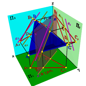 Пусть дана плоскость AВС и прямая а. Требуется найти точку пересечения прямой с плоскостью и определить видимость прямой по отношению к плоскости.