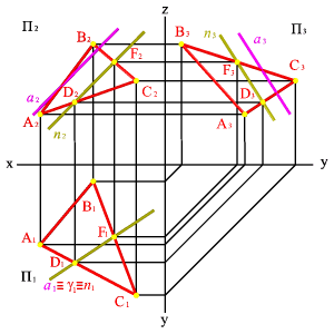 3. Находим линию пересечения вспомогательной плоскости с заданной. Горизонтальный след плоскости g1 пересекает проекцию плоскости A1В1С1 в точках D1 и F1, которые определяют положение горизонтальной проекции п1 - линии пересечения плоскостей g и AВС. Для нахождения фронтальной и профильной проекции п спроецируем точки D и F на фронтальную и профильную плоскости проекций.