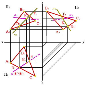 4. Определяем точку пересечения прямых а и п. На фронтальной и профильной проекциях линия пересечения плоскостей п пересекает проекции а в точке К, которая и является проекцией точки пересечения прямой а с плоскостью AВС, по линии связи находим горизонтальную проекцию К1.