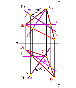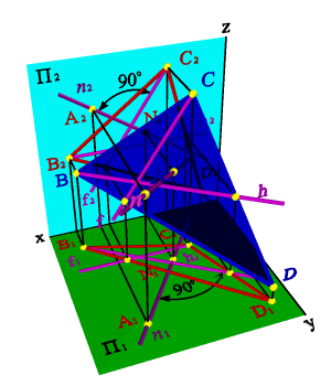 В плоскости ВСD построим фронталь f и горизонталь h. В горизонтальной плоскости проекций проведем через точку А1 прямую n1 перпендикулярно горизонтальной проекции горизонтали h1, а на фронтальной плоскости проекций через точку А2 прямую n2 перпендикулярно фронтальной проекции фронтали f2, согласно, теореме о перпендикуляре к плоскости, полученная прямая n будет перпендикулярна плоскости ВСD.