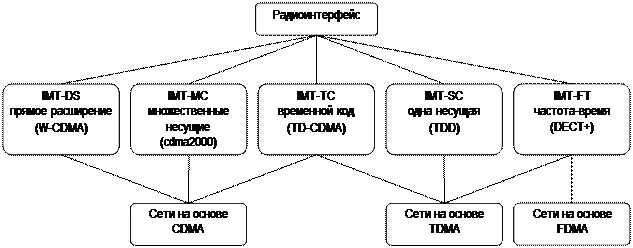 На рис. 1 показаны альтернативные схемы, которые были разработаны как часть IMT-2000[2]. В спецификации охвачен набор радиоинтерфейсов для оптимизации производительности в разных радиосредах. Для обеспечения постепенного перехода от существующих систем первого и второго поколения к системам третьего поколения понадобились пять альтернативных схем.