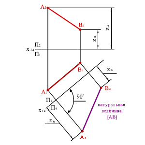 Выберем новую плоскость проекций П 4, параллельно отрезку АВ и перпендикулярно плоскости П 1. Введением новой плоскости, переходим из системы плоскостей П 1 П 2 в систему П 1 П 4, причем в новой системе плоскостей проекция отрезка А 4 В 4 будет натуральной величиной отрезка АВ.