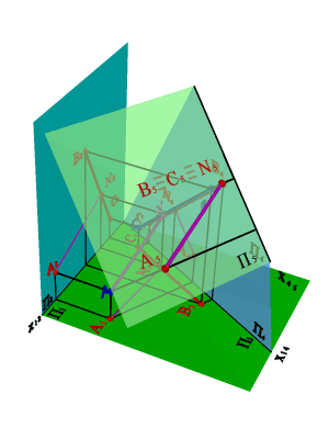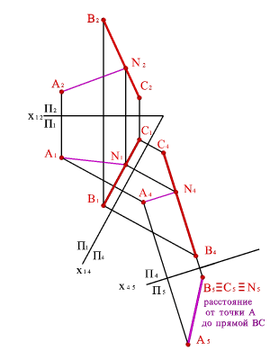 | Рисунок 55. Определение расстояния от точки до прямой общего положения методом замены плоскостей проекций |
