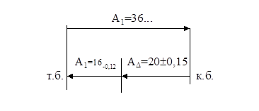 Если база на детали, выбранная конструктором, является неудобной для использования ее в качестве базовой при механической обработке или контроле, то технолог может выбрать новую базу и от нее проставить свой размер, который называется производный, до обрабатываемой или контролируемой поверхности. В этом случае надо рассчитать величину допуска производного размера.