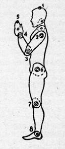 При создании биотехнических систем специалистам прежде всего нужны средние антропометрические параметры операторов, обслуживающих эти системы. К таким параметрам относятся средний рост и средние соотношения (размеры) между основными антропометрическими точками на теле. При конструировании машин необходимо учитывать восемь таких точек (рис. 4.1): 1 – верхушечная (наивысшая точка тела); 2 – плечевая (центр плечевого сустава); 3 – лучевая (верхняя точка головки лучевой кости); 4 – шиловидная (низшая точка на шиловидном отростке лучевой кости); 5 – пальцевая (конечная точка среднего пальца); 6 – тазобедренная; 7 – верхнеберцовая внутренняя (наивысшая точка большой берцовой кости); 8 – нижнеберцовая внутренняя (низшая точка внутренней лодыжки).