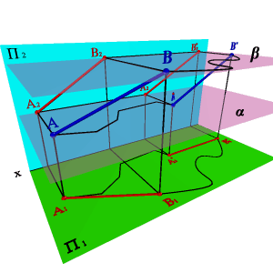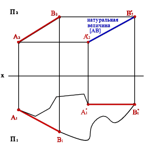 | Рисунок 57. Определение натуральной величины отрезка методом плоскопараллельного перемещения |