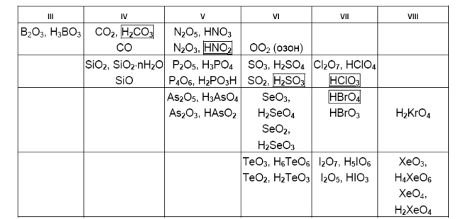 Помимо высшей степени окисления n (n – номер группы, верхние строчки в каждой клеточке таблицы), у большинства неметаллов достаточно устойчива в кислородных соединениях степень окисления n–2: (нижние строчки):