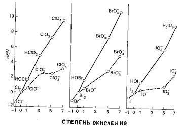 Рис.8. Диаграмма окислительных состояний для хлора, брома, иода в кислых (pH=0, сплошные линии) и щелочных v(рН=14, пунктирные линии) растворах.
