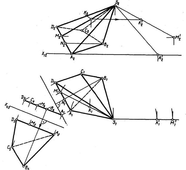 а) определяют истинную величину всех ребер пирамиды любым из известных способов. На рис. 85 способом вращения найдена длина боковых ребер и способом замены плоскостей проекций определено основание пирамиды;