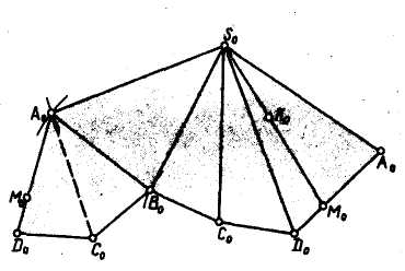 б) по найденным трем сторонам (рис. 86) строят какую-либо из боковых граней, например SoAoBo, пристраивая к ней следующую SoBoCo, а затем и остальные грани (масштаб развертки уменьшен);