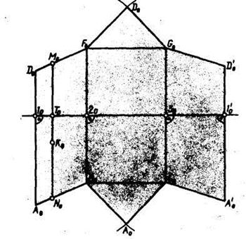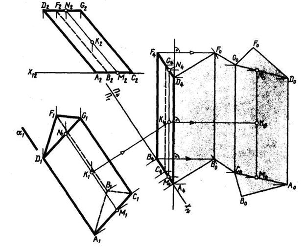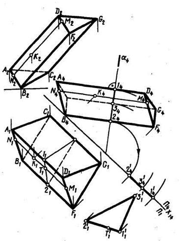 Так как после совмещения с плоскостью α все стороны грани ADFB спроецируются на П4 без искажения, то вершины F и В окажутся удаленными от неподвижных точек оси вращения А и D на расстояние, равное истинной длине АВ или DF. Но отрезки АВ и DF проецируются на П1 в натуральную величину. Таким образом, засекая перпендикуляры, по которым перемещаются точки F4 и B4 дугой радиуса lАВ, можно получить искомые точки развертки Fo и Вo.