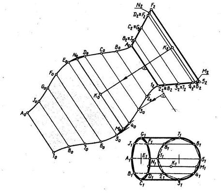 На рис. 90 выполнена развертка наклонного эллиптического цилиндра. Так как нижнее основание его параллельно горизонтальной плоскости проекций, то для построения развертки использован способ раскатки. Параллельность образующих цилиндра горизонтальной плоскости проекций делает возможным выполнить развертку без предварительного преобразования проекций.
